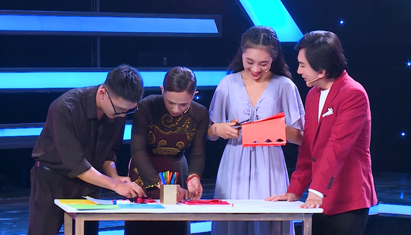 Với trò chơi “Dùng giấy màu xếp thành bức tranh” như đang trong lớp học mỹ thuật, cả hai đội chơi vô cùng lúng túng bắt đầu các công đoạn đầu tiên cắt tỉa giấy màu thành các bông hoa. Đội “4.0” xuất sắc hoàn thành bức tranh thủ công sớm với thông điệp ý nghĩa: “Một bông hoa đỏ tượng trưng cho tình yêu to lớn của ba mẹ dành cho con, bông hoa xanh thể hiện tia hy vọng, niềm tin vào tương lai tươi sáng của các con.”