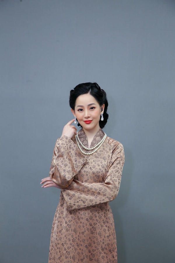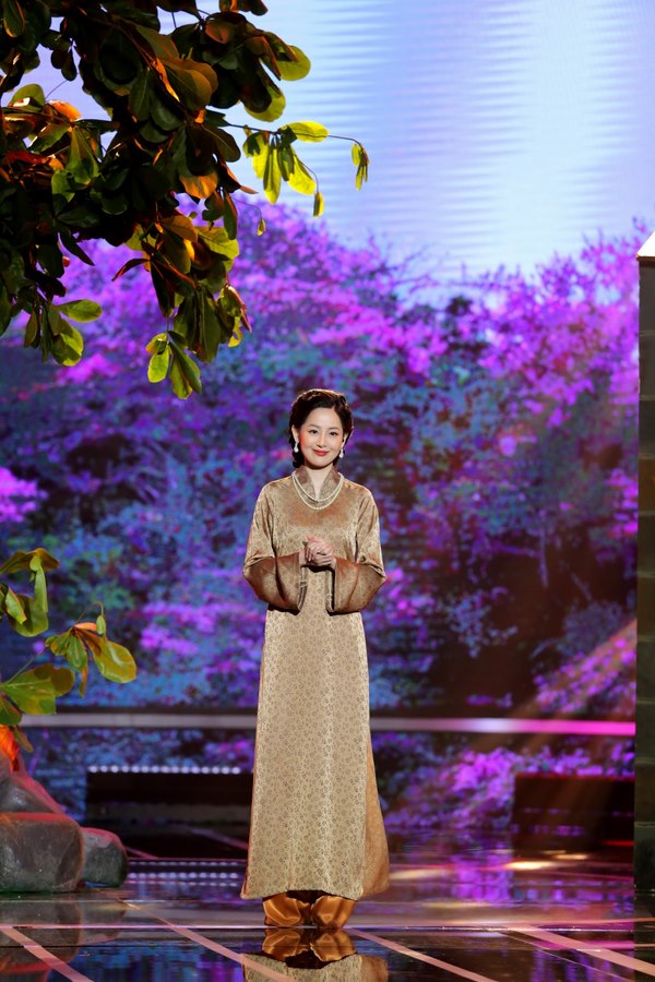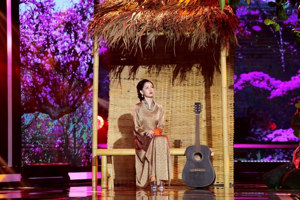 Với chủ đề nhạc sĩ Thanh Sơn – người nhạc sĩ nổi danh với những bài hát bolero, trữ tình, quê hương nổi tiếng, Lê Đình Minh Ngọc tiếp tục khoác lên người trang phục áo dài. Song, nữ MC không hề gây nhàm chán khi khéo léo lựa chọn một thiết kế với điểm nhấn nằm ở phần tay áo xòe rộng. Phần họa tiết trên thân áo giúp cho hình ảnh của người đẹp trở nên lung linh và thu hút hơn khi xuất hiện trên sân khấu.