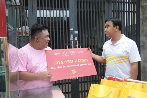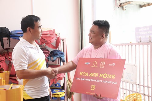 Cảm phục trước tấm lòng của “chàng béo” Quang Khải, MC Quyền Linh đã thay mặt chương trình Hát cho ngày mai đã trao tặng cho anh 2 chiếc xe bán bánh mì cùng 30 phần quà dành cho các em học sinh tại lớp học tình thương Ngọc Việt.