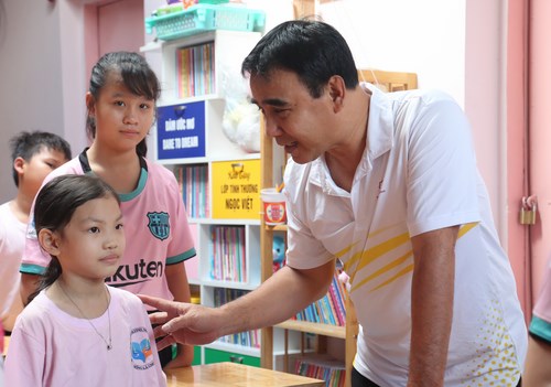 Không chỉ thế, MC Quyền Linh còn lên tiếng kêu gọi các mạnh thường quân hãy tới thăm lớp học tình thương của thầy Khải để cùng chung tay nhân rộng thêm nhiều lớp học như thế nữa cho các em nhỏ có hoàn cảnh khó khăn. Nhận được món quà của chương trình, “chàng béo” Quang Khải xúc động chia sẻ: “Thật sự Khải rất bất ngờ khi chương trình Hát cho ngày mai và Tập đoàn Hoa Sen đã mang đến những phần quà ý nghĩa dành tặng cho Khải cũng như các em nhỏ. Khải không biết nói gì hơn ngoài hai từ ‘Cám ơn!’. Cảm ơn tất cả mọi”.