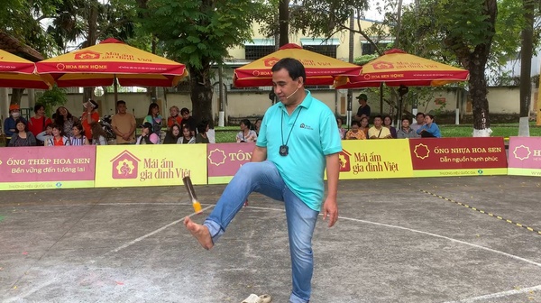 Không chỉ thế, trong “giờ giải lao”, MC Quyền Linh còn đi chân đất chơi đá cầu với mọi người. Cầu vừa tới, ông bố 2 con vừa dùng chân đá được 2 quả thì đã phải dùng tay đỡ cực hài hước. Nam MC cũng bật cười nắc nẻ với chính hành động của mình và cho biết đã quá lâu rồi mình không chơi đá cầu nên kỹ năng đã trở về con số 0.