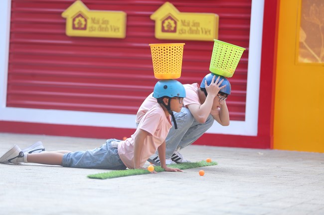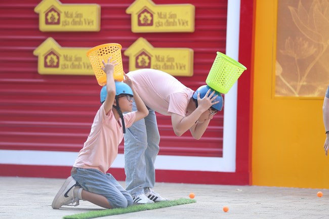 Ngay lập tức, Bánh Mỳ đã ngồi xổm thật thấp, thậm chí là không dám cử động để ba Đạt có thể ném bóng dễ hơn. Trong khi đó, Xá Xị đã quỳ xuống để chiếc rổ ở vị trí thấp hơn. Có khi em còn nằm hẳn xuống đất để đưa chiếc rổ đến thật gần với mẹ. Song, vì không ăn ý nên bóng vẫn cứ bắn ra ngoài, mất một lúc sau thì thử thách mới hoàn thành.