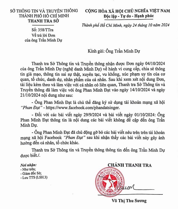 Kết quả sau khi Thanh Tra Sở làm việc: ông Phan Minh Đạt chủ nhân của tài khoản mạng xã hội “Phan Đạt” chia sẻ với nội dung không liên quan đến diễn viên Minh Dự. Ông Phan Minh Đạt đã chủ động gỡ những bài viết trên sau khi nhận thấy các nội dung này gây ảnh hưởng đến cá nhân và tổ chức khác.