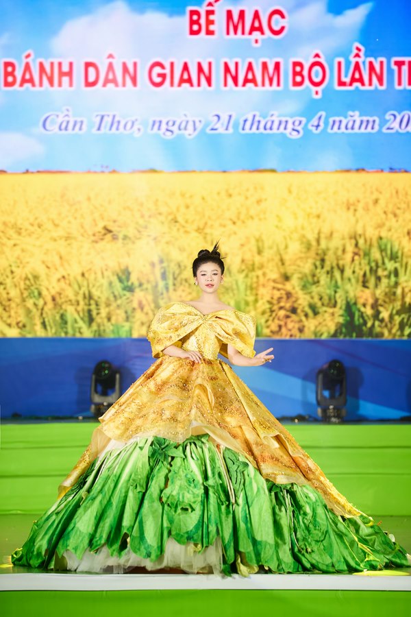 Xuất hiện trên sân khấu buổi lễ, mẫu nhí 13 tuổi Katherine Minh Vy thần thái tự tin cùng vẻ ngoài sáng bừng đầy xinh đẹp khi diện thiết kế Bánh xèo của NTK Nguyễn Minh Công. Trình diễn một thiết kế khủng hơn 3000m vải, Minh Vy vẫn tự tin catwalk và thể hiện trọn vẹn tinh thần của thiết kế với những dáng pose chuyên nghiệp. Mẫu nhí đã khiến NTK Nguyễn Minh Công xúc động và hạnh phúc khi được nhìn thấy thiết kế của mình được trình diễn và nhận về vô vàn lời khen từ phía khán giả của buổi lễ.