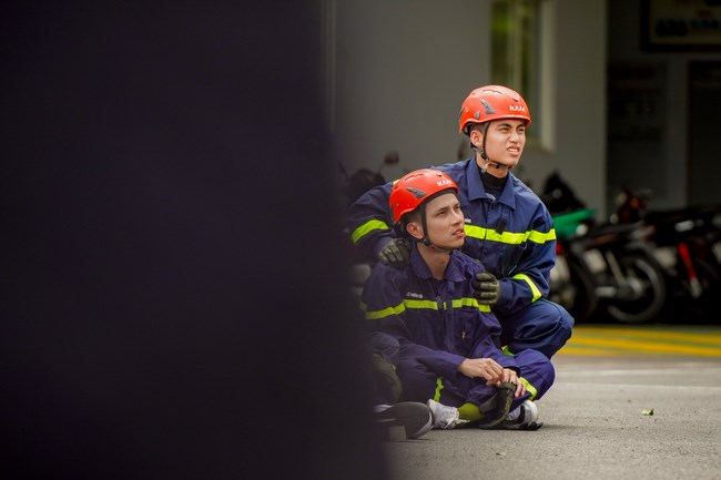 Nhiệm vụ không chỉ đòi hỏi sự phối hợp nhịp nhàng mà còn là sức bền, sự tỉnh táo và bản lĩnh của từng người. Vác trên mình hơn 20kg dụng cụ chữa cháy, di chuyển gấp rút từ tầng 1 lên tầng 7 bằng thang bộ, các chiến sĩ nhập vai thấm thía phần nào nỗi nhọc nhằn thường nhật của lực lượng Cảnh sát PCCC & CNCH. “Trên người tôi là cả bộ đồ và dụng cụ rất nặng đang trì tôi xuống. Có đôi lúc tôi thở không nổi, chân cũng không nhấc lên nổi. Đây là buổi thực chiến tốn sức nhất từ trước đến nay”, Lê Dương Bảo Lâm trải lòng. Ngô Kiến Huy cũng thừa nhận khi lên đến tầng 7, nơi xảy ra đám cháy, họ gần như hoa mắt chóng mặt
