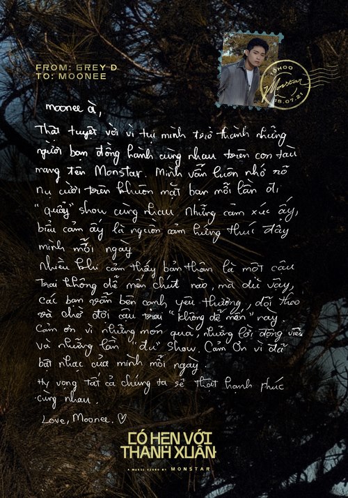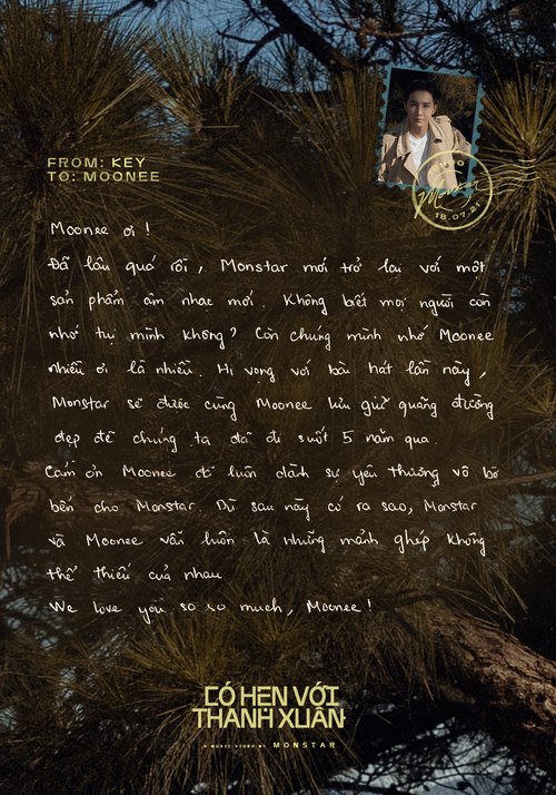 Sau hơn 2 năm vắng bóng, việc MONSTAR trở lại cùng đội hình đầy đủ 5 thành viên, hé lộ lý do GREY D vắng mặt để hoàn thành nghĩa vụ quân sự đã khiến cộng đồng fan không khỏi bất ngờ. Mới đây, các thành viên đã gửi thư tay đến MOONEE (tên fanclub của MONSTAR) để chia sẻ đầy chân thành về lần comeback này và cảm ơn sự đồng hành cũng như chờ đợi của khán giả trong thời gian vừa qua. Đồng thời, không chỉ phát hành MV mới, MONSTAR còn tung lịch trình hoạt động dày đặc với Fan Meeting Online, Album…
