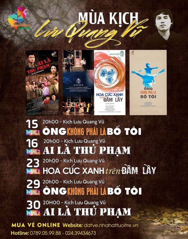 Như đã hẹn trước vào mỗi dịp thu về, “Mùa kịch Lưu Quang Vũ” năm nay sẽ tái ngộ khán giả cùng những vở diễn tiêu biểu “Ông không phải là bố tôi”, “Ai là thủ phạm”, “Hoa cúc xanh trên đầm lầy” và “Sống mãi tuổi 17” diễn ra trong tháng 7, tháng 8 qua diễn xuất của những nghệ sỹ tài năng: NSƯT Đức Khuê, NSƯT Hoa Thúy, Thanh Sơn, Thu Quỳnh, Lương Thu Trang, Bá Anh, Quang Ánh, Thanh Bình, Thanh Dương, Nguyệt Hằng, Anh Thơ, Chí Huy, Thanh Tú, Minh Cúc, Đức Anh, Du Ka, Hương Thủy…
