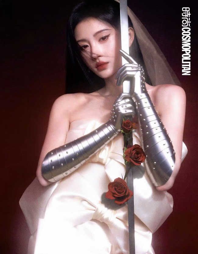 Thiết kế khi được chuyển đến khá vừa vặn với Cúc Tịnh Y nên không cần chỉnh sửa nhiều. Trong loạt ảnh, nữ diễn viên mang bao tay kim loại, cầm kiếm. Hình ảnh hoa hồng đỏ xuất hiện cũng tạo nên sự tương phản độc đáo.