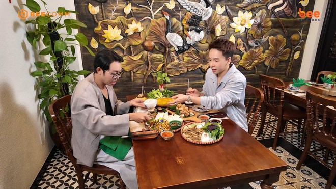 Diễn viên Năm Chà cho biết anh là người miền Tây nên muốn đưa Kan Hy trải nghiệm ẩm thực đặc trưng của quê hương, cùng bạn đồng hành “đón Tết miền Tây” ngay giữa lòng TP.HCM. Điểm đến mà cả hai lựa chọn là nhà hàng Mùa nước nổi. Ngay từ bên ngoài, không gian nhà hàng đã tạo cảm giác gần gũi, thoáng đãng với hình ảnh chiếc cầu cây mộc mạc, hồ nước bình dị cùng nhiều loại cây xanh mang đến sự mát mẻ, dễ chịu.