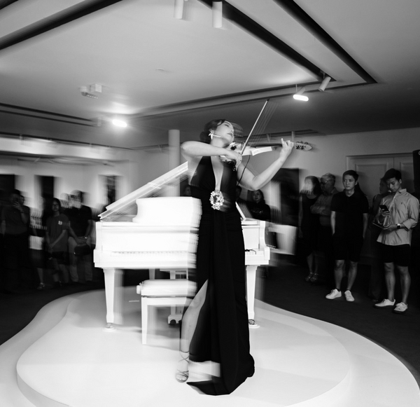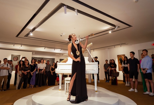 Sự xuất hiện của Jmi Ko cùng những giai điệu vĩ cầm lúc trầm lúc bổng đầy hùng cường như thổi thêm hồn vào không gian nghệ thuật hội họa nơi đây, khiến buổi triển lãm thêm phần thu hút.