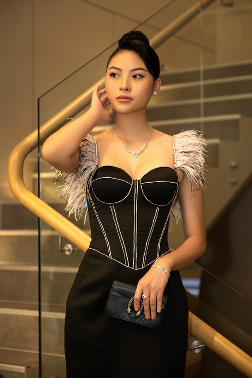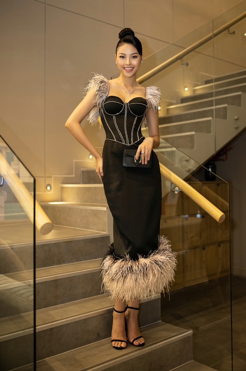 Đào Thị Hà xuất hiện trong bộ váy đen sang trọng, quý phái với điểm nhấn là phần vai đính đá và lông, cùng với mái tóc được búi cao làm tôn lên dáng vóc thanh mảnh của Top 5 Hoa Hậu Hoàn Vũ Việt Nam 2019.