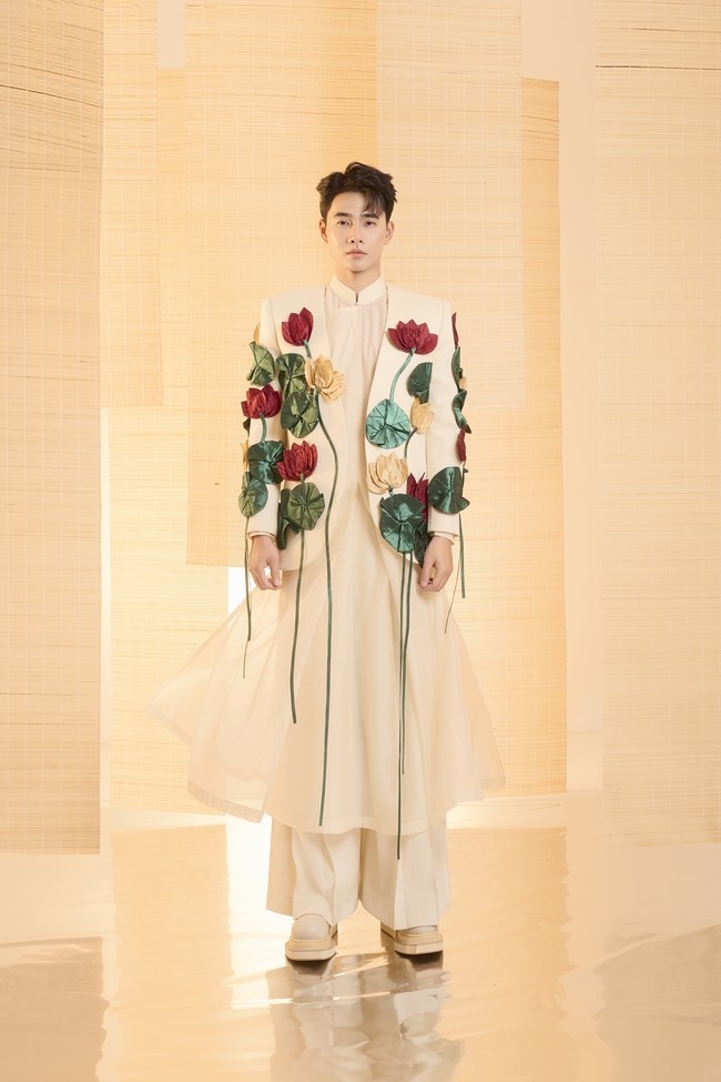 Khác với sắc màu rực rỡ của các BST Tết những năm trước, năm nay Nguyễn Minh Công lựa chọn tone màu be nhã nhặn, thanh tao với chất liệu voan tơ làm tone màu và chất liệu chính cho BST. Đơn giản nhưng không hề buồn tẻ, BST mới này của Nguyễn Minh Công đầy nổi bật, ấn tượng khi được làm bật lên với những chi tiết đính kết 3D tinh xảo. NTK Nguyễn Minh Công đã mang ngôn ngữ của bức tranh truyền thống đến với thời trang bằng các kỹ thuật đính 3D khi tạo ra những chi tiết cá chép và hoa sen sống động. Các chi tiết này được gia công tỉ mỉ, đỉnh kết cầu kỳ cùng kỹ thuật phối màu ấn tượng đã tô điểm nét đẹp truyền thống của trang phục và tăng tính hiện đại, phá cách cho các thiết kế.