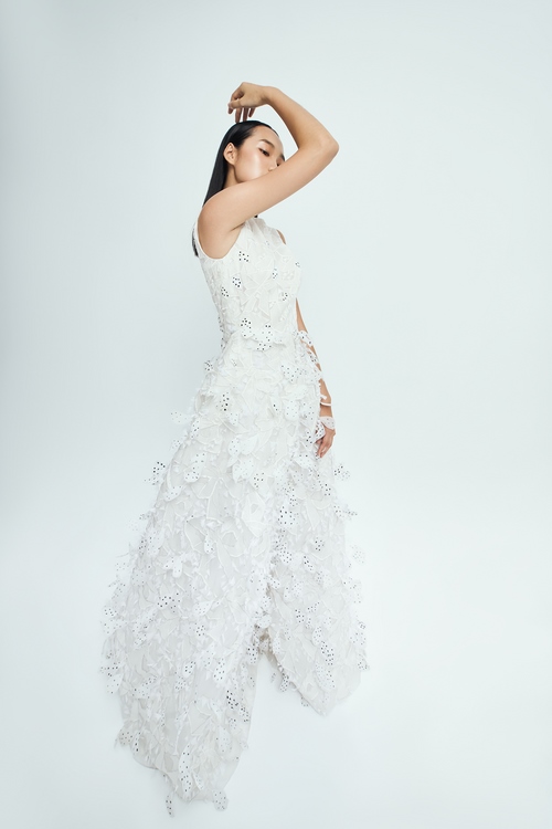Trên nền các chất liệu cao cấp như organza, taffeta, tơ hay lụa, nhà thiết kế Công Trí áp dụng các kĩ thuật xử lí cầu kì để tạo ra bề mặt chất liệu mới, mang đến tính đột phá cho bộ sưu tập. Không khó để nhận ra kĩ thuật đan móc đã được Công Trí áp dụng từ mùa mốt Xuân Hè 2021 và trở thành điểm sáng trong xu hướng quốc tế.