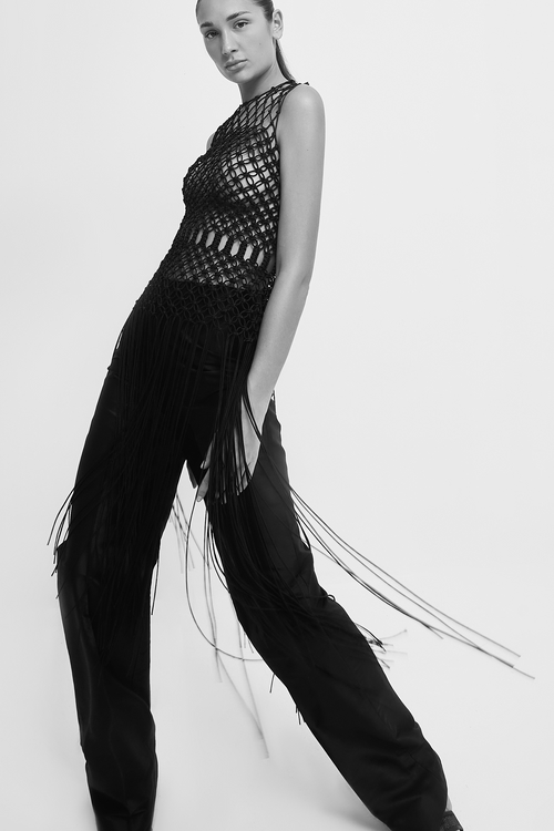 Tiếp nối từ mùa mốt Xuân Hè 2021, Công Trí giới thiệu chiếc áo bra-top phối cùng quần ống rộng và áo khoác mang vẻ đẹp nổi loạn. Phom dáng oversize được áp dụng trên các thiết kế áo khoác và suit xếp li. Tại mẫu số 19 thuộc bộ sưu tập, nhà thiết kế kéo léo phối một chiếc áo sơ mi bằng vải tơ trong suốt bất cân xứng cùng áo vest đen, điểm nhấn ở chi tiết lá cổ ngoại cỡ khiến thiết kế trở nên khác lạ và ấn tượng.