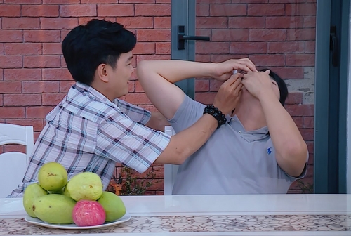 Mở đầu tiểu phẩm tình huống, nhân vật Hà Trí Quang vừa ngửa đầu trên ghế vừa kêu la than vãn vì mãi chưa thấy anh hai là nhân vật Linh Tý mang thuốc nhỏ mắt về. Vừa về đến nhà đã bị em trai trách móc, Linh Tý giải thích: “Phải đợi mua xong rồi chờ người ta thối tiền nữa. Anh mua thuốc nhỏ mắt cho em rồi đây nè. Em trai mà hành anh hai quá vậy”. Nhân vật Linh Tý vừa đưa cho em trai quả xoài và lừa là thuốc nhỏ mắt, Hà Trí Quang cũng nhận lấy quả xoài và đưa lên mắt nhỏ mà không hề hay biết đang bị anh hai chơi xỏ. Nhân vật Linh Tý phàn nàn: “Tại em ngồi trước máy vi tính nhiều quá. Anh nói rồi, máy vi tính có ánh sáng xanh mà mình ngồi lâu quá không được”.