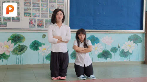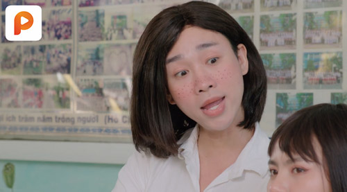 Ở một diễn biến khác, Hải Triều hóa thân thành cô giáo tiếng anh với tạo hình “thuần việt” áo bà ba, tóc đen thẳng tắp. Sau khi làm điên đảo đầu óc học sinh với đề bài chuyển ngữ vô cùng khó nhằn như “cái mặt”, “thánh thần ơi” hay “miễn bàn”, cô Hải Triều khó tính chốt xanh rờn: Tất cả 0 điểm, ở lại lớp.