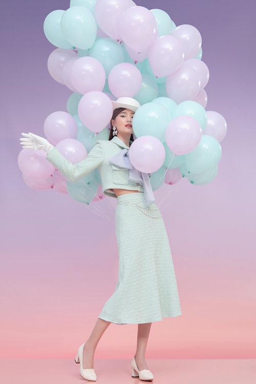 Lan Ngọc hoá quý cô cổ điển với áo dáng dài kết hợp với chân váy, đi kèm găng tay, mũ, phụ kiện ngọc trai to bản. NTK phát huy thế mạnh ở những đường cắt sắc nét, tinh tế.