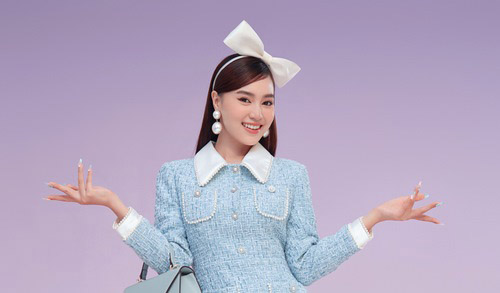 Bộ cánh màu xanh mang đến vẻ ngoài nữ tính, kiêu kỳ cho nữ diễn viên. Vải tweed mang đến sự cứng cáp cho trang phục đã được Đỗ Mạnh Cường dung hoà khéo léo bởi sự mềm mại, quyến rũ của chiếc nơ với chất liệu xuyên thấu mỏng tang. Túi xách, giày được trộn phối khéo léo với nhiều sắc độ khác nhau, tạo nên sự nhất quán nhưng vẫn có điểm nhấn như một bức tranh có chiều sâu với những mảng đậm nhạt đan cài vào nhau.