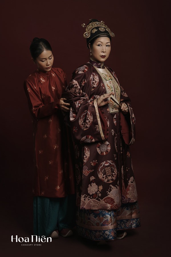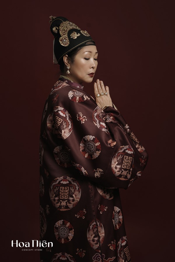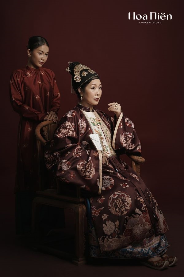 Mới đây, NSND Hồng Vân kết hợp cùng thương hiệu Việt phục Hoa Niên – Năm Tháng Tươi Đẹp đã giới thiệu đến giới chuyên môn và công chúng bộ ảnh phỏng dựng áo Bình Lĩnh của Mệnh phụ triều Nguyễn kết hợp cùng Mão Ngũ phượng.