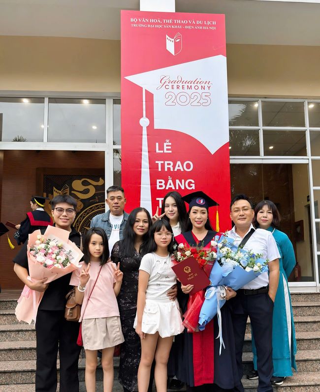Ngày lễ tốt nghiệp đã trở thành một dấu ấn đầy cảm xúc khi không chỉ có thầy cô và bạn bè đến chúc mừng, mà còn là sự hội ngộ ấm áp của cả gia đình lớn và dòng họ của NSND Trịnh Kim Chi. Đặc biệt, nhiều người thân trong dòng họ từ TP.HCM đã bay vào Hà Nội, mang theo hoa tươi, lời chúc và cả những cái ôm nghẹn ngào, như một minh chứng cho tình yêu thương vô điều kiện luôn sát cánh bên chị trong mọi chặng đường.