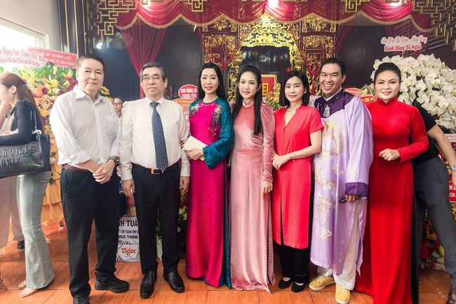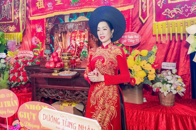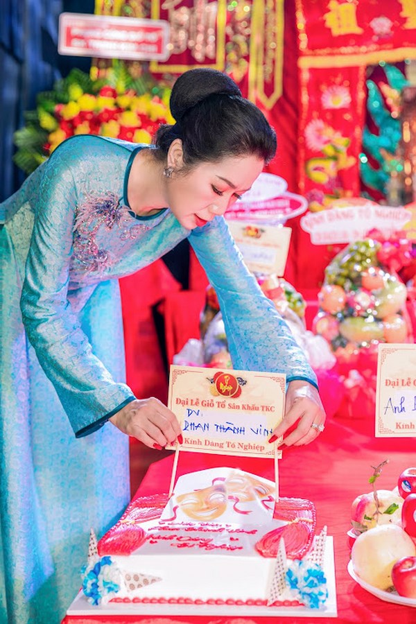NSND Trịnh Kim Chi thành kính dâng hương lên bàn thờ Tổ. Á hậu Việt Nam 1994 nói bên cạnh việc tổ chức lễ cúng Tổ, những ngày này chị còn cùng nhiều đồng nghiệp chung tay gây quỹ, hướng về đồng bào miền Bắc gặp khó khăn do thiên tai, bão lũ. Bên cạnh vai trò nghệ sĩ, bà chủ một sân khấu kịch, Trịnh Kim Chi hiện giữ chức Phó chủ tịch Hội Sân khấu TP HCM.