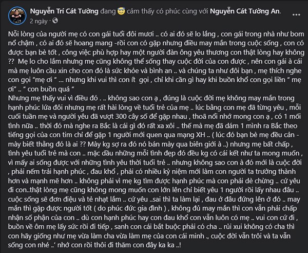 Cũng vì thế mà vừa mới đây, trên trang cá nhân của nữ nghệ sĩ có dòng chia sẻ đầy tâm sự về cô con gái 21 tuổi khiến nhiều người xúc động. Cát Tường cho biết, cô đã rất lo lắng, mất ngủ và trăn trở khi một ngày con gái nhắn tin về nói về nỗi buồn, cô đơn, trống trải và thật sự đang rất cần chỗ dựa. Cô hiểu, con gái đang buồn trong chuyện tình cảm và rất cần chỗ dựa tinh thần để vượt qua những cơn sóng lớn đầu đời.