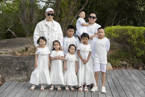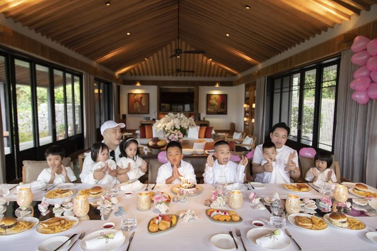 Trong chuyến đi này, NTK Đỗ Mạnh Cường chuẩn bị trang phục đồng điệu màu kem, hoạ tiết hoa lá cho các con. Trong tiệc sinh nhật của Nhím, anh cho cả gia đình diện trang phục màu trắng. Bữa tiệc được tổ chức ấm cúng với bánh kem, trái cây và những món hải sản các con yêu thích.