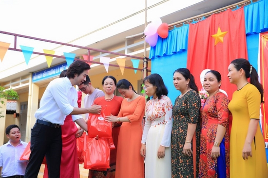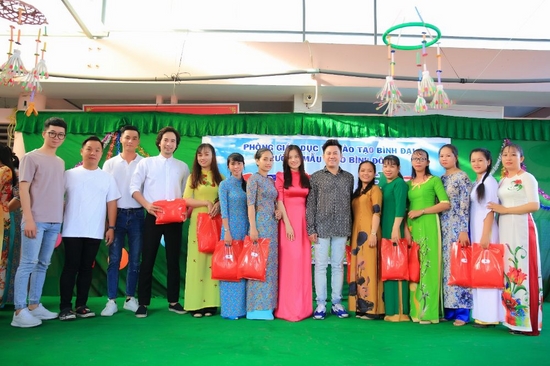 Giản dị trong trang phục đời thường, NTK Việt Hùng, ca sĩ Quốc Đại, DVĐA Đoàn Minh Tài, người mẫu Vũ Linh, chuyên gia trang điểm Phạm Minh Quân thân thiện phát quà cho các cô giáo. Tràn ngập niềm hạnh phúc và xúc động khi trở về mảnh đất quê hương, nơi chôn rau cắt rốn của mình, DVĐA Đoàn Minh Tài chia sẻ: “Trở về quê hương mình, làm được một việc thật hạnh phúc và ý nghĩa là tặng quà nhân ngày khai trường cho các cô giáo và học sinh. Mong các cô giáo sẽ có một bộ áo dài mặc thật đẹp trong các dịp lễ, Tết, hội họp. Mong các cô và các chị em phụ nữ luôn vui vẻ và hạnh phúc!”.