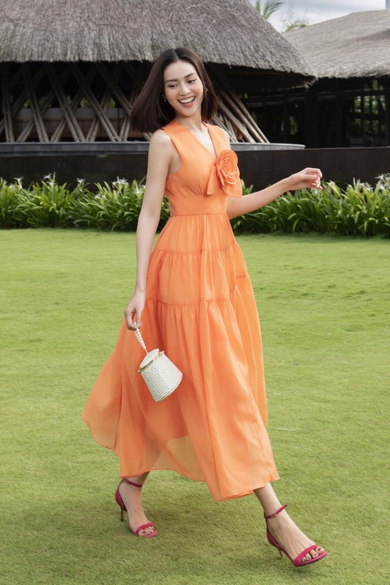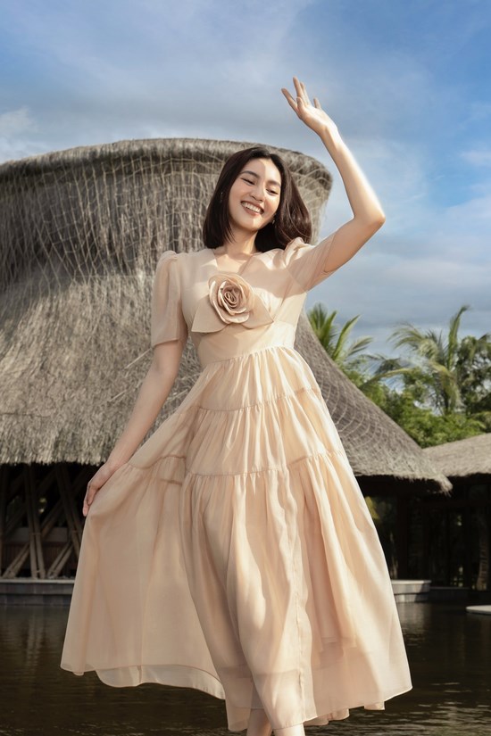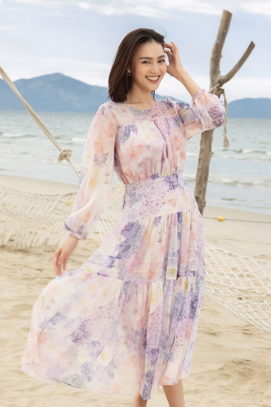 Với thời tiết mùa Hè, các trang phục mát mẻ, phom dáng dịu dàng thoải mái như maxi tay bồng, váy xòe cổ điển, set áo cùng chân váy xếp li,… lên ngôi. Trang phục của Lan Ngọc được SIXDO cách điệu bằng họa tiết pastel mùa hạ và những tiểu tiết tinh giản nữ tính như lớp bèo xếp trên ngực hay dáng tay trễ vai, nơ thắt, và hoa cài ton sur ton,…