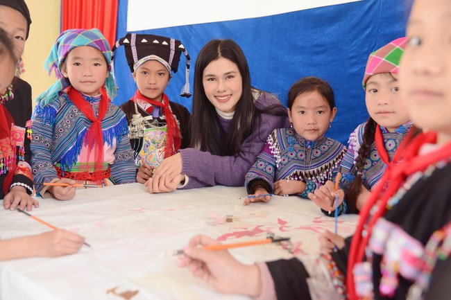 Điểm nhấn đặc biệt của buổi giao lưu tại Lào Cai là hoạt động tô màu bức tranh hoa sen 54 cánh hoa – biểu tượng xuyên suốt của dự án “54 Dân Tộc Việt Nam”. Trong không khí ấm áp, 15 em học sinh đại diện cho các dân tộc H’Mông, Dao, Tày, Nùng và Giáy ở khu vực Si Ma Cai đã được mời lên tô màu vào những cánh hoa tương ứng với dân tộc của mình.