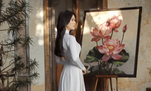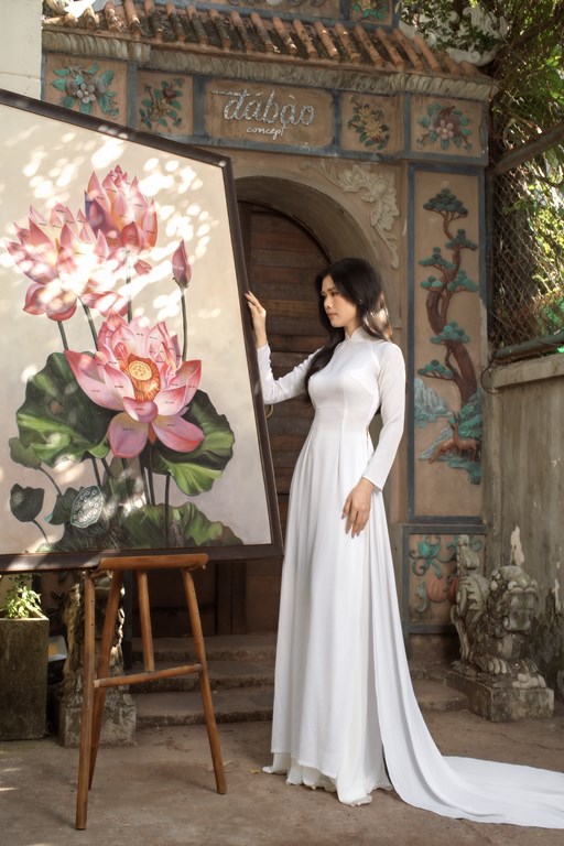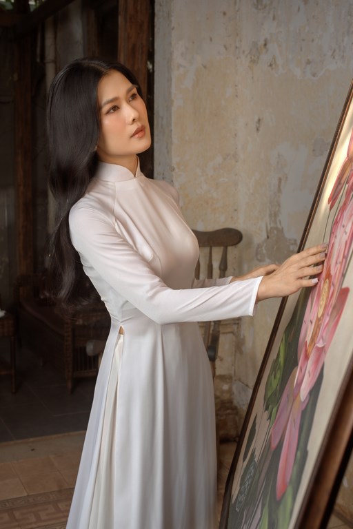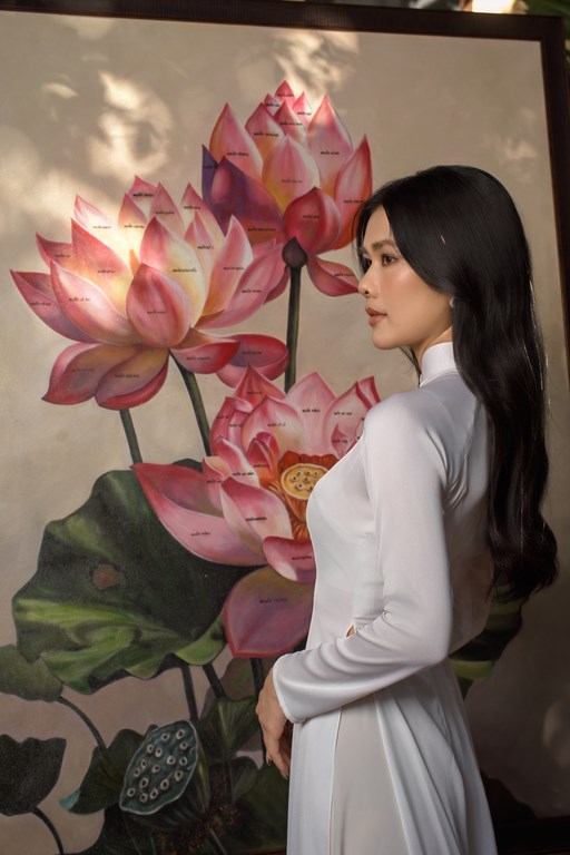 Hoa sen từ lâu đã là biểu tượng của tinh thần Việt Nam, loài hoa cao quý vừa gắn với màu sắc tinh thần tâm linh, vừa là hình ảnh đầy cảm hứng: vươn lên từ bùn đất nhưng vẫn giữ được sự thanh khiết, cao quý và bền bỉ. Trong bức tranh, mỗi cánh sen mang một màu sắc riêng, tượng trưng cho bản sắc văn hóa, ngôn ngữ, phong tục và đời sống của từng dân tộc. Khi đứng cạnh tác phẩm trong tà áo dài trắng, Phúc Anh như trở thành điểm giao thoa giữa hành trình cá nhân và hành trình cộng đồng.