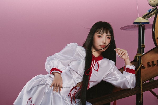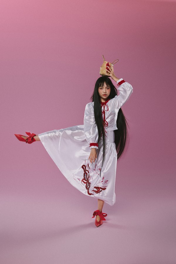 Bộ ảnh với gam màu đỏ – trắng mang đặc trưng phong cách Á Đông. Không màu mè, giọng ca vàng trong làng dân ca diện trang phục độc nhất màu trắng nhưng lại rất bắt mắt. Váy và áo cách được thiết kế cách điệu, phần cạp cao ở váy tạo sự thon gọn cho vòng eo, điểm xuyết bằng các chi tiết màu đỏ nổi bật và họa tiết con cò truyền thống được thêu tỉ mỉ.