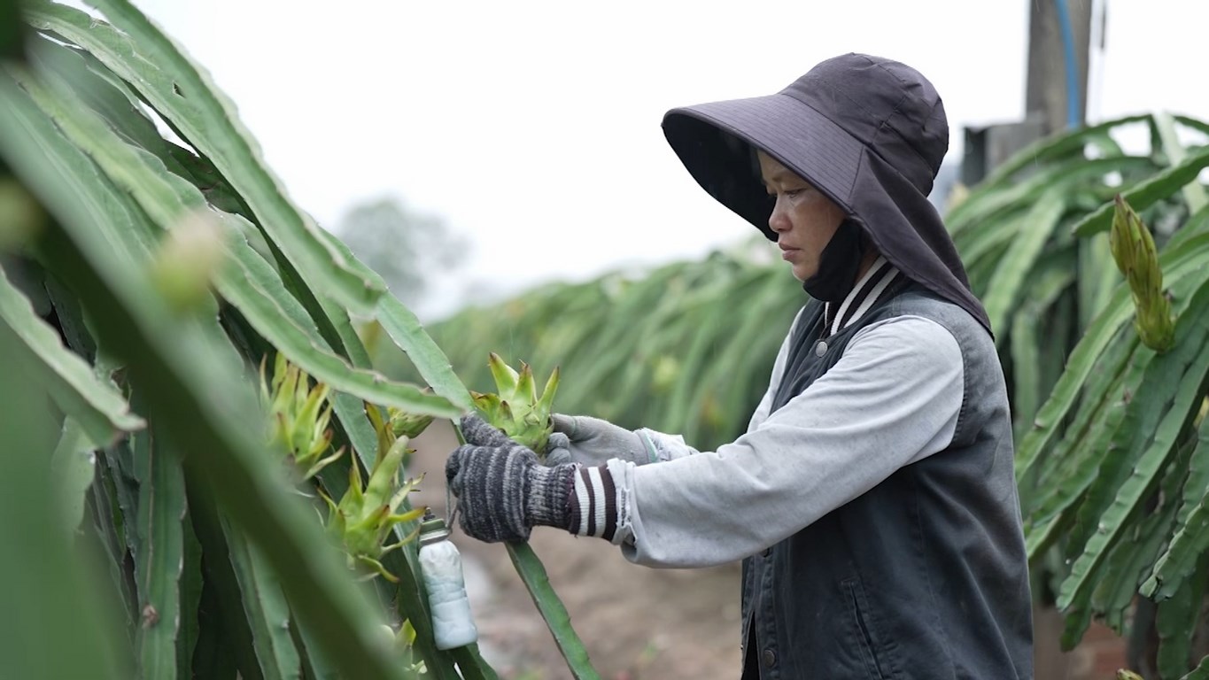 Chị Thơ làm nghề bọc mận thuê, thu nhập khoảng 250.000 – 300.000 đồng/ngày, nhưng không ổn định do công việc theo mùa. Ngoài ra, chị còn làm cỏ, trồng cây ăn trái trên mảnh vườn nhỏ để kiếm thêm thu nhập.