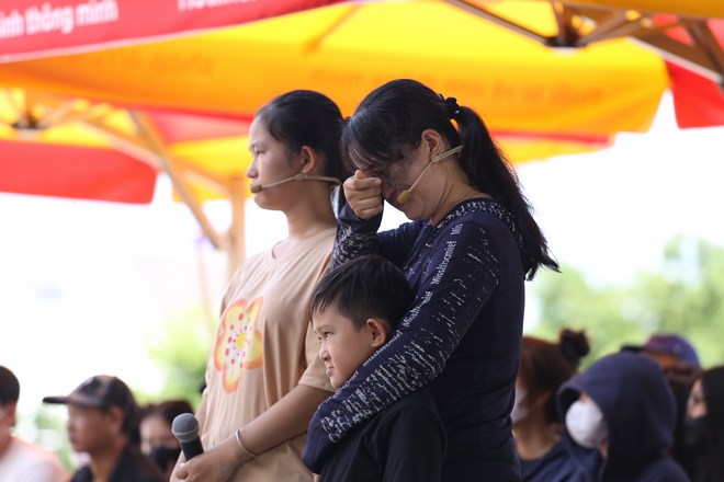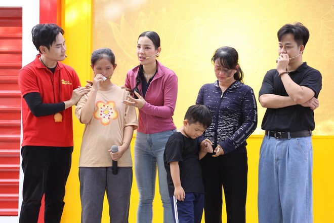 MC Dương Hồng Phúc lặng người khi nghe Diễm Quỳnh kể về bữa cơm chan nước lạnh vì thiếu thốn. Nam MC cúi đầu bày tỏ sự khâm phục chị Nguyễn Mộng Thùy, người mẹ đang mang nhiều bệnh tật nhưng vẫn tảo tần mưu sinh để nuôi hai con nhỏ.