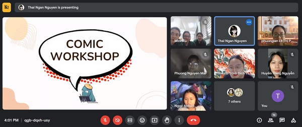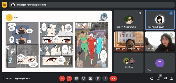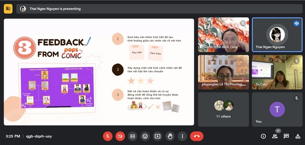 Trong buổi hội thảo trực tuyến, POPS Comic đã chia sẻ tổng quan về ngành truyện tranh tại Việt Nam, bao gồm các quy trình sản xuất liên quan, phản hồi về kịch bản, và bản vẻ của sinh viên. Bài thuyết trình ngắn gọn, đơn giản và dễ hiểu, giúp sinh viên có được sự hiểu biết toàn diện về truyện tranh.