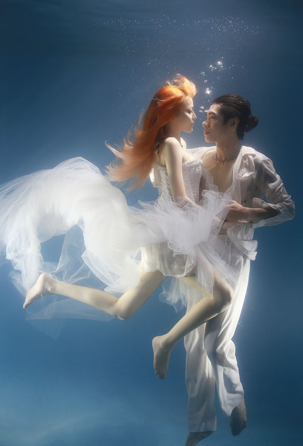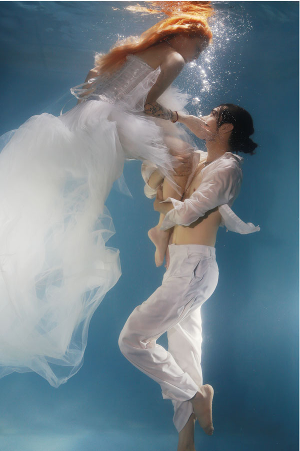 Bộ ảnh chụp dưới nước vừa ra mắt chính là ý tưởng lãng mạn của Quang Đăng và người yêu của mình. Cả hai đều mặc trang phục màu trắng, trong khi Quang Đăng mặc áo sơ mi trắng để lộ hình thể săn chắc, Yee Pink lại diện một chiếc váy ôm sát khoe trọn đường cong quyến rũ đính kèm voan cưới thướt tha trên đầu. Rất có thể, nam biên đạo đang “ngầm” khoe bộ ảnh cưới đặc biệt nhân dịp sắp về chung một nhà?