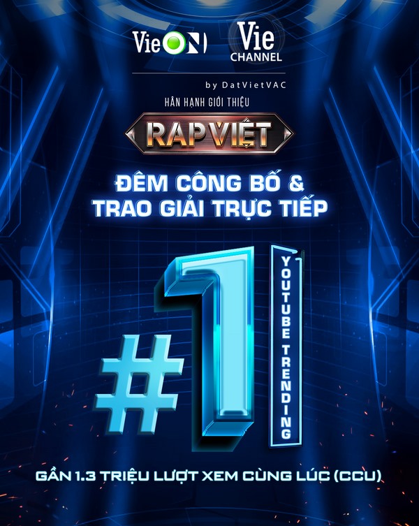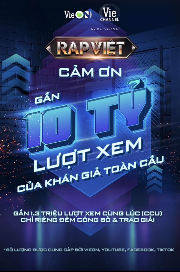 Đêm Công bố & Trao giải Rap Việt Mùa 3 (2023) mang về loạt thành tích siêu ấn tượng, tiếp tục khẳng định vị thế không hề lung lay qua 3 mùa phát sóng, xứng danh Chương trình m nhạc được yêu thích nhất với hơn 10 tỷ lượt xem từ khán giả trên các nền tảng trực tuyến.