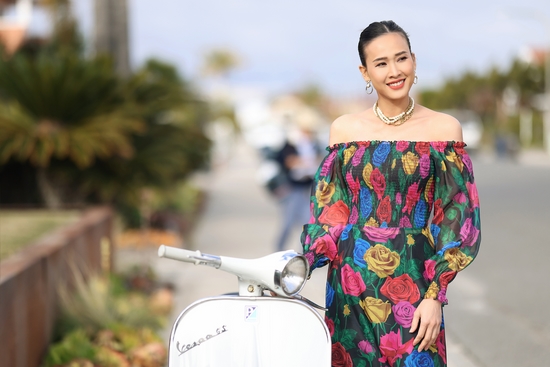Hoa hậu Phụ nữ Việt Nam qua ành 2006 Dương Mỹ Linh định cư tại Mỹ nhiều năm qua. Chị cũng sở hữu 2 chiếc áo dài trong BST dành cho mùa Tết của SIXDO. Nếu như chiếc áo trễ vai mang đến vẻ ngoài gợi cảm, trẻ trung thì dáng áo tay bồng lại thể hiện hình ảnh thanh lịch, cổ điển.