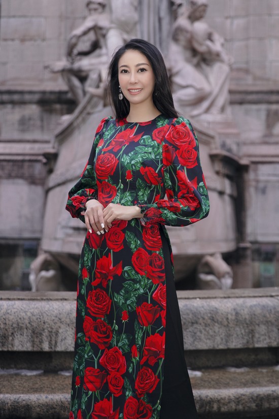 Diễn viên điện ảnh Diễm My và Hoa hậu Việt Nam 1992 Hà Kiều Anh cùng diện chiếc áo dài với hoạ tiết hoa hồng đỏ nổi bật. Diễm My diện trong dịp gặp bạn bè ở San Francisco, còn Hà Kiều Anh mặc dạo chơi trên đường phố New York.