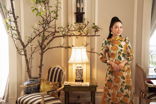 Nghệ sĩ múa Linh Nga tranh thủ ghi lại những khoảnh khắc đầu năm mới với áo dài hoạ tiết hoa hồng màu vàng. Chị trang điểm nhẹ nhàng, cột tóc cao uốn xoăn nhẹ tạo nên sự hoà hợp với vẻ thanh lịch của tà áo.