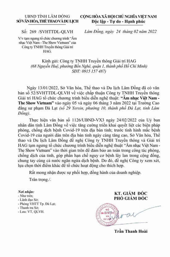 Thực hiện văn bản số 1126/UBND-VX3 ngày 24/2/2022 của UBND tỉnh Lâm Đồng về việc tăng cường triển khai quyết liệt các biện pháp phòng chống dịch bệnh Covid-19 trên địa bàn tỉnh, trước tình hình mắc bệnh Covid-19 của người dân trên địa bàn tỉnh ngày càng tăng cao, Sở Văn hóa – Thể thao và Du ịch Lâm Đồng đã gửi công văn đề nghị The Show Vietnam lựa chọn thời điểm khác để tổ chức chương trình. Toàn văn chỉ thị được đính kèm trong email.