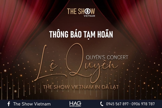 Lời đầu tiên, HAG Entertainment và The Show Vietnam xin gửi đến mọi người lời xin lỗi chân thành nhất. Chúng tôi rất tiếc phải thông báo đêm nhạc QUYÊN’S CONCERT của nữ ca sĩ Lệ Quyên và các khách mời Bằng Kiều – Lân Nhã – Wowy dự tính tổ chức vào tối 5/3/2022 sẽ tạm hoãn lại vì tình hình dịch Covid-19 tại tỉnh Lâm Đồng đang có diễn biến phức tạp trở lại.