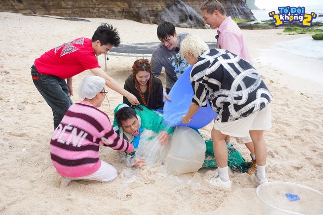 Một trong những thử thách thú vị ở tập 8 chính là “Hãy Cứu Lấy Đồng Đội”, nếu 1 trong 2 thành viên không kịp được ra đáp án đúng thì người còn lại sẽ phải nhận hình phạt bóng nước.
