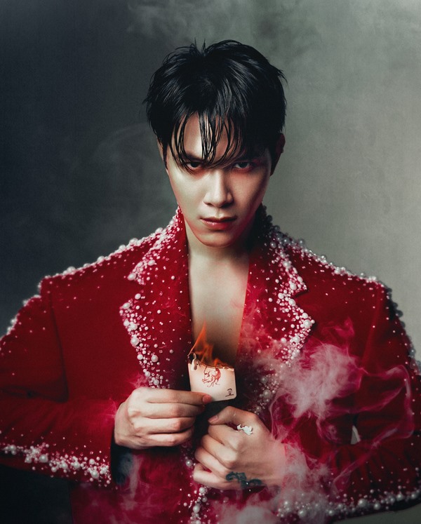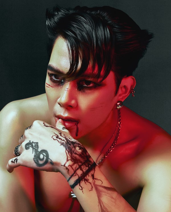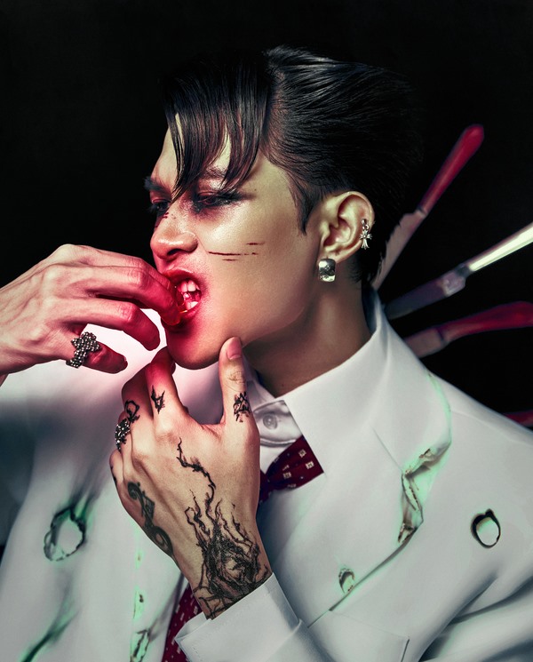 Trong bộ ảnh mới, Anh Tú Atus không hóa thân vào một nhân vật cụ thể mà chọn phong cách ma mị với 5 concept khác nhau. Tại đây anh phá cách với mẫu áo đầy dao găm, đôi cánh đen như Maleficent đến tạo điểm nhấn “khắc chữ” trên lưng. Bên cạnh sự hỗ trợ về phục trang, thần thái từ đôi mắt toát ra của nam diễn viên đủ khiến người xem phải thuyết phục.