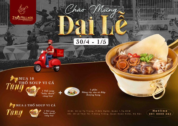 Hoà chung niềm hân hoan nhân dịp Đại lễ kỷ niệm Ngày giải phóng miền Nam – Thống nhất đất nước 30/4 và Ngày Quốc tế Lao động 1/5, nhà hàng Thai Village có chương trình MUA 5 TẶNG 1, MUA 10 TẶNG 2 dành riêng cho dịp lễ này.
