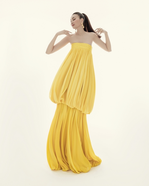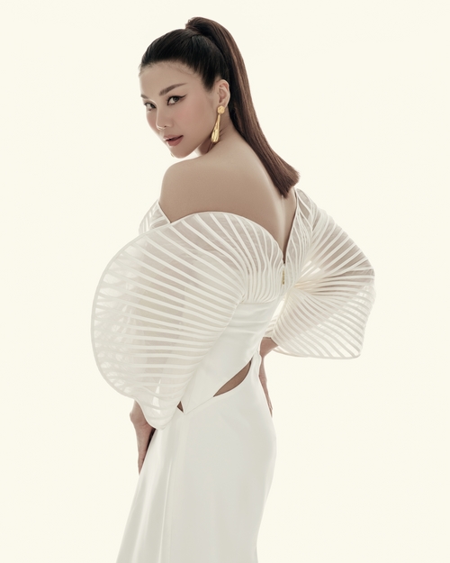 Nổi bật vẻ đẹp trưởng thành của Thanh Hằng là một thiết kế đầm khoét lưng. Trên nền chất liệu satin của Ý, nhà thiết kế Công Trí tinh giản kiểu dáng và tập trung điểm nhấn ở chi tiết vải tulle phủ pha lê Swarovski – đẹp tựa như một dải thiên hà dành riêng của người phụ nữ.
