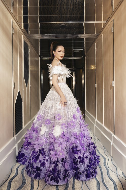 Thiết kế mang sắc tím ombre và phom dáng tùng xòe, gợi cho người đối diện liên tưởng đến hình ảnh những cánh đồng oải hương trải dài. Điểm nhấn của bộ trang phục là chi tiết những bông hoa được làm thủ công, kết hợp cùng lông vũ đàn xen vào nhau tạo cảm giác nhẹ nhàng, bay bổng. Lý Nhã Kỳ như một nàng công chúa với nhan sắc rạng rỡ khi xuất hiện trên thảm đỏ.