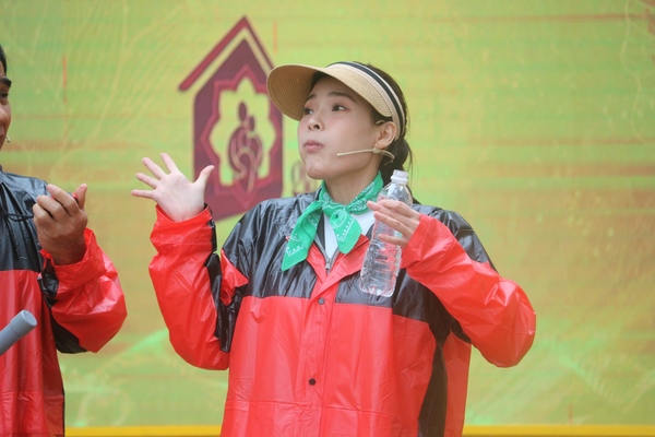 Thúy Diễm ngã nhào khi thực hiện thử thách để giúp đỡ trẻ em mồ côi