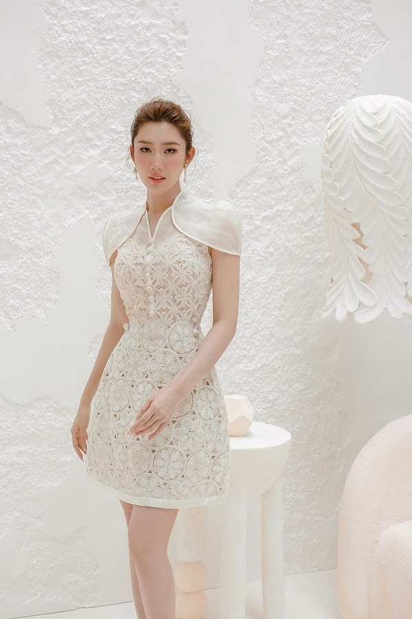 Không quá rực rỡ nhưng lại ẩn chứa nét đặc trưng rất riêng, mỹ nhân tự tin diện các trang phục ren, kết hợp hài hòa màu trắng, be. Cô mang vẻ đẹp của mùa thu trầm lắng, lẳng lặng làm rung động mọi người. Đó là nhờ nhà thiết kế thành thạo kỹ thuật đắp ren, làm cho các tầng lớp họa tiết hoa ẩn hiện trên vải.