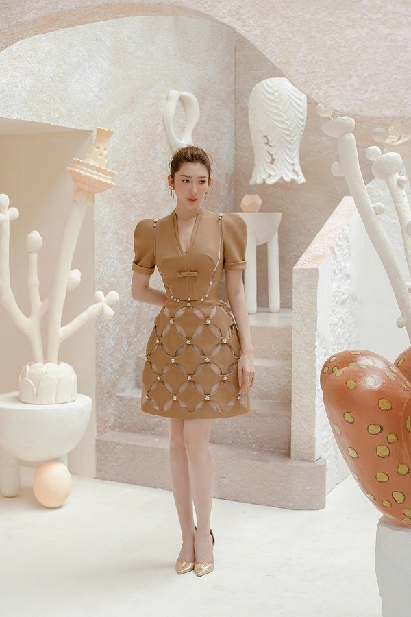 Ngoài ra, Thúy Ngân mặc trang phục sắc nâu, hợp xu hướng thời trang của những ngày cuối năm. Nữ diễn viên quê Tiền Giang chọn váy dài qua đầu gối, mang lại cảm giác ấm áp, sáng trọng. Các họa tiết ren đính trên váy uyển chuyển uốn lượn theo đường cong của Thúy Ngân, giúp cô khoe vẻ quyến rũ của mình một cách kín đáo. Ngoài ra, người đẹp cũng vô cùng thanh lịch với chiếc đầm theo style monogram màu nâu nhạt.